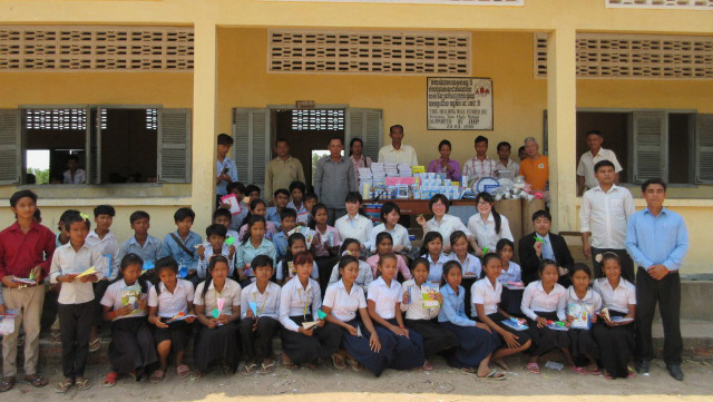 私たち生徒会の代表は3月に視察に行ってきました。 現地についてまず驚いたのは、生徒や先生はもちろん、その保護者の方たち、小さい子供たち、村の長老のような人たちまで、村中の人が集まって出迎えてくれたこと。私たちを歓迎してくれていることをうれしく思うと同時に、それほどこの中学校を大切に思ってくれているんだな、と感激しました。カンボジアは不幸な歴史から立ち上がり、今復興に向かって国中が活気にあふれています。生徒たちもそれぞれに夢を持って元気に勉強していました。その笑顔に、たくさんの勇気をもらって感じたのは「これからは一方的な“支援”ではなく、お互いの良いところを学びあう“交流”を続けて行きたい」ということです。 ── 2014年度生徒会長 N.S.さん